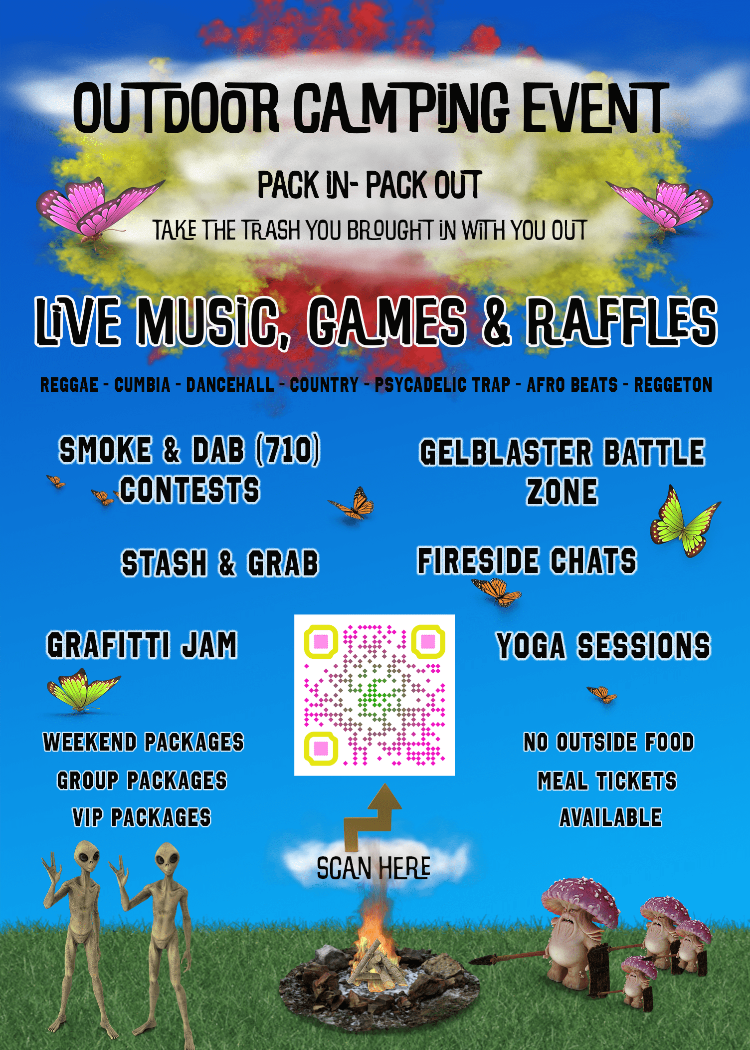 The VIP PACKAGE includes access to an additional eleven (11) acres of the fairground next to vendors and performers, larger camping spaces, swag bag & access to more community areas. This includes dry camping spaces for RV’s and MUCH MORE! Click the link here to see the full list of perks!